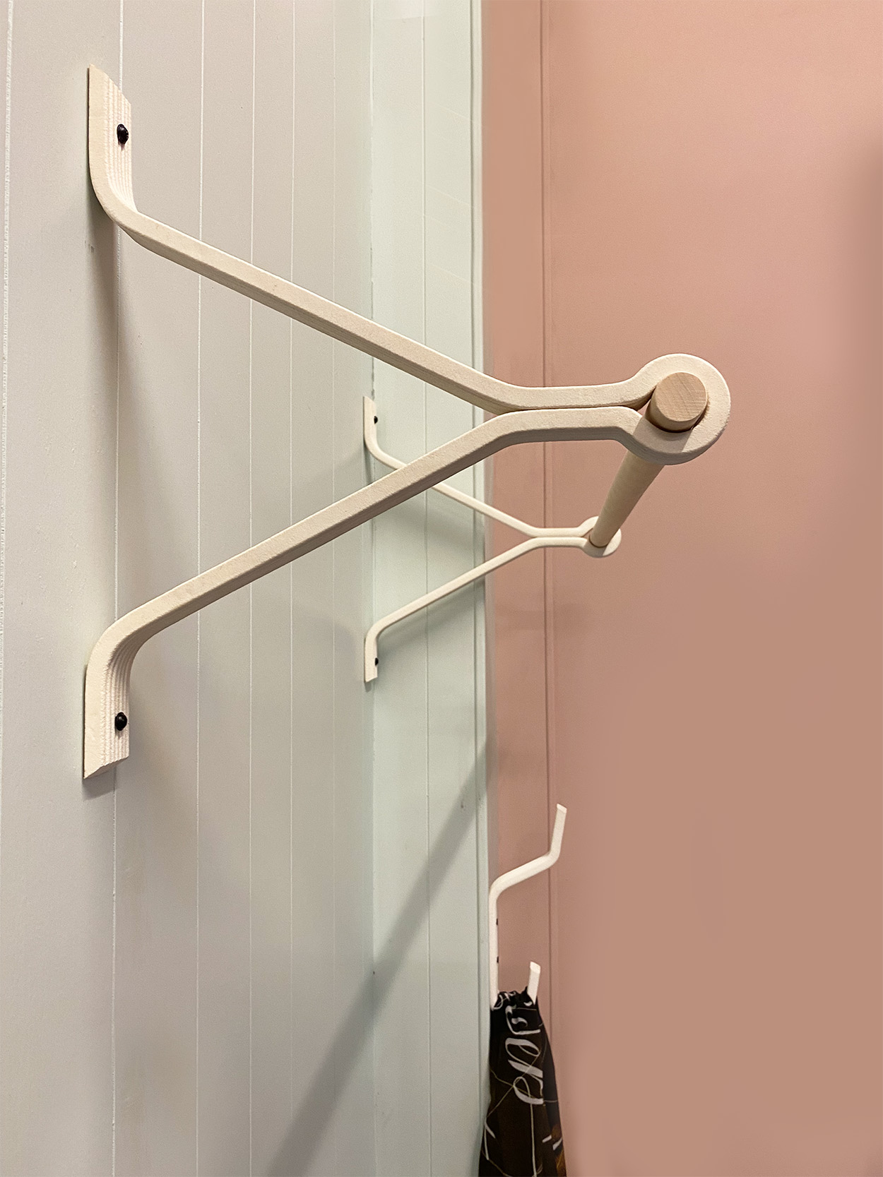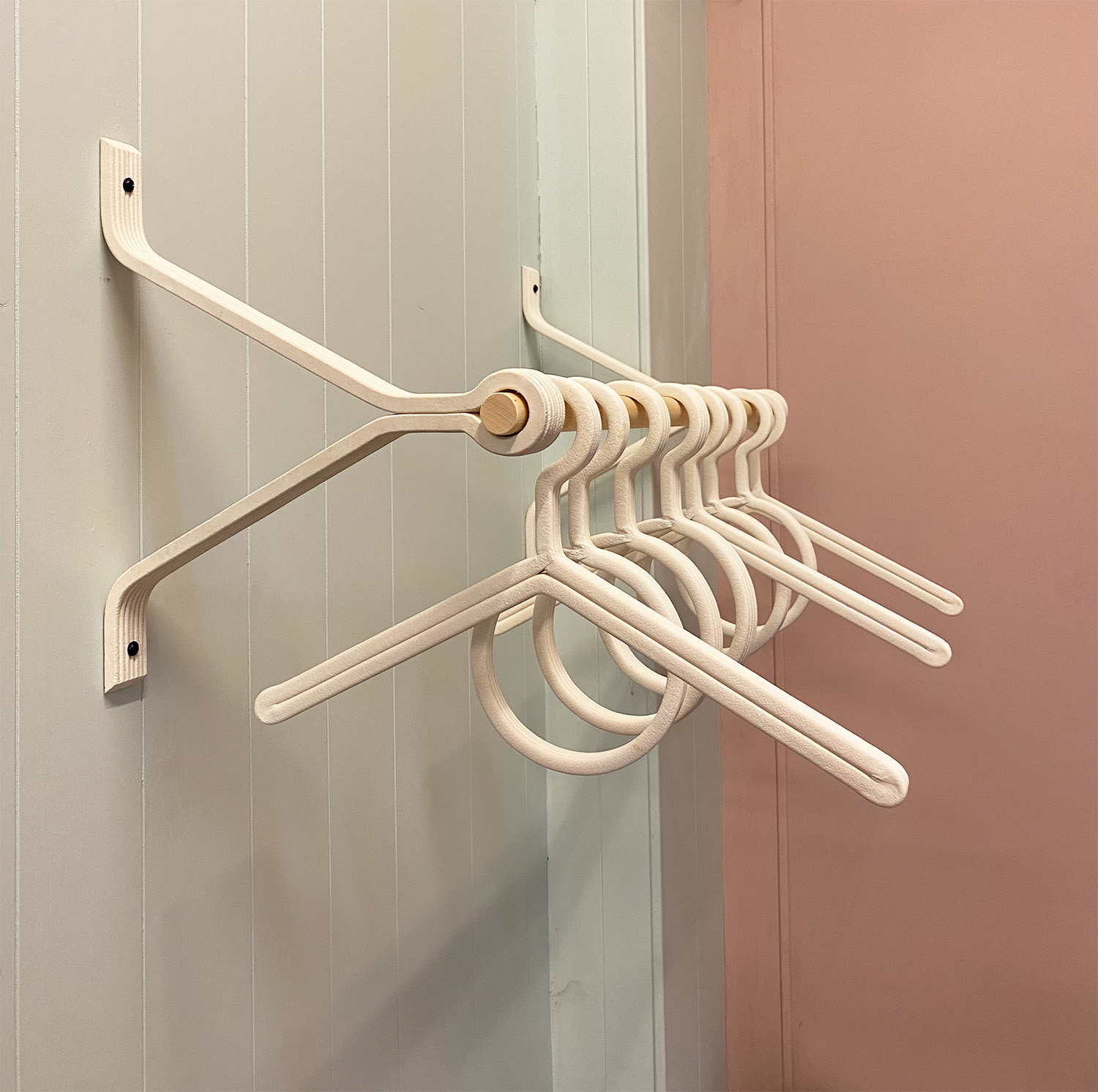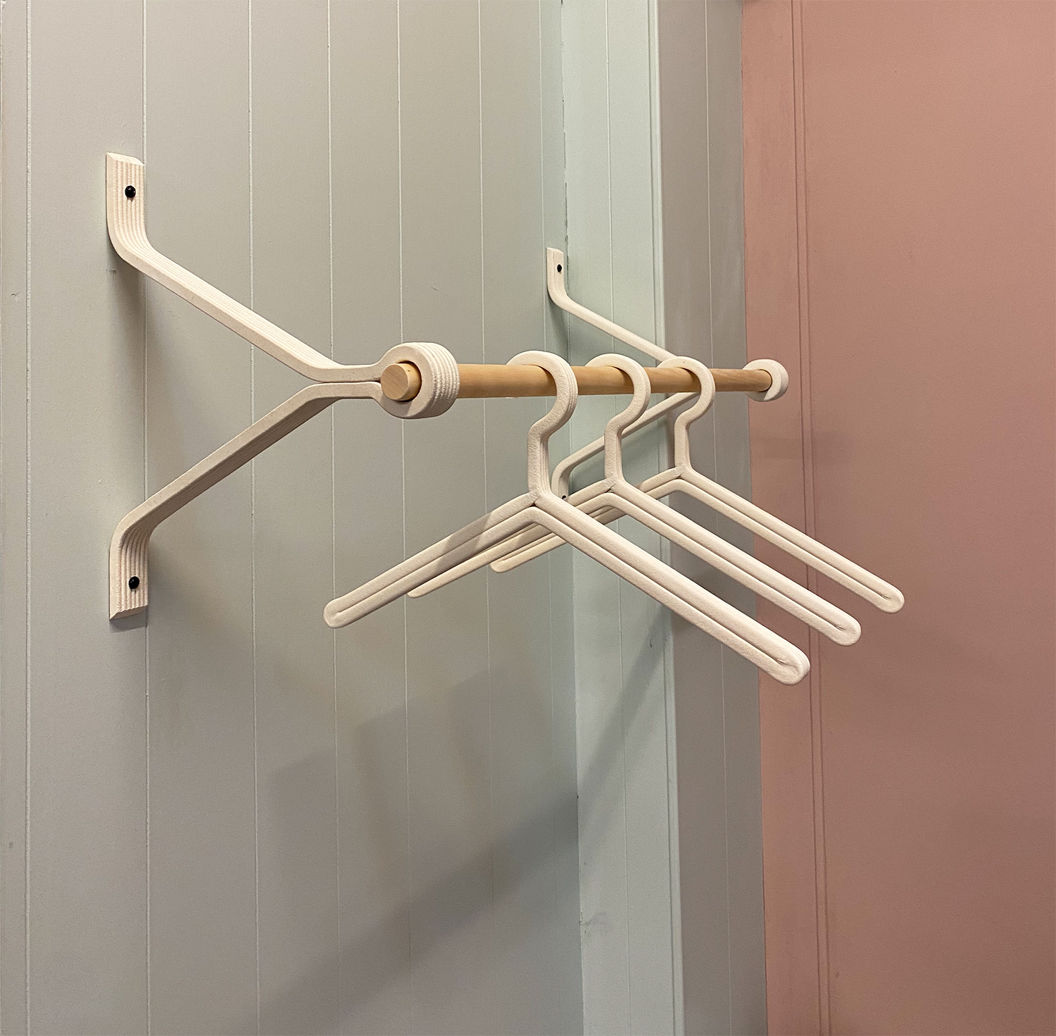 Bracket-Bar-70 is een minimalistische functionele kapstok die bestaat uit twee beugels en een drager van 70 cm. De drager is van rondhout, de beugels zijn van geprinte houtvezel. Monika Mulder wil niet meer produceren dan nodig is en de voorraad aanpassen aan de directe vraag. Deze kapstok is fris, heeft een scandinavische uitstraling en is licht van gewicht. Bovendien is hij zeer eenvoudig te monteren. Voor de kapstok ontwierp zij ook een bijbehorende cirkelvomige beugel voor shawls en dassen. En eveneens een kledinghanger in dezelfde stijl.