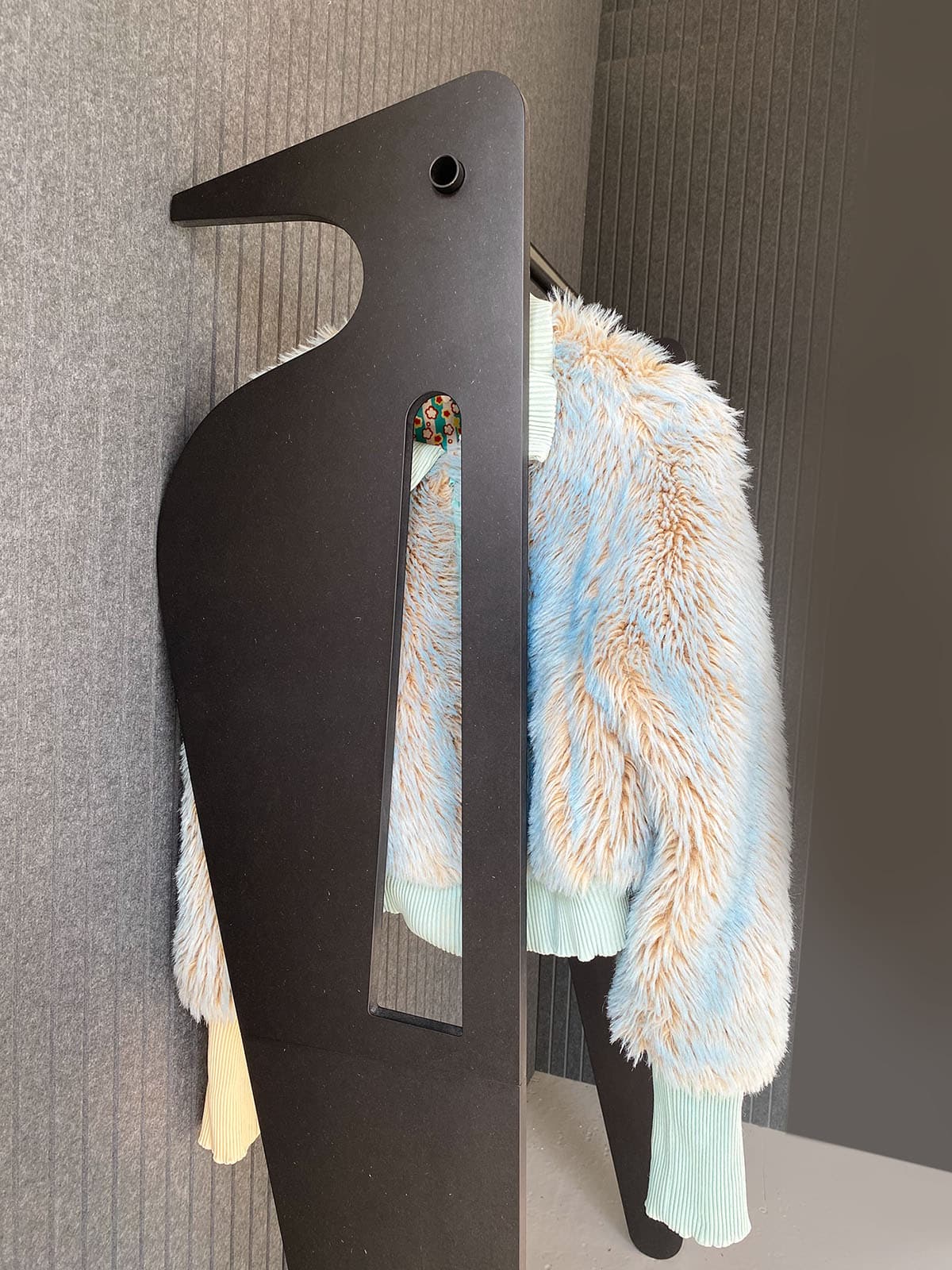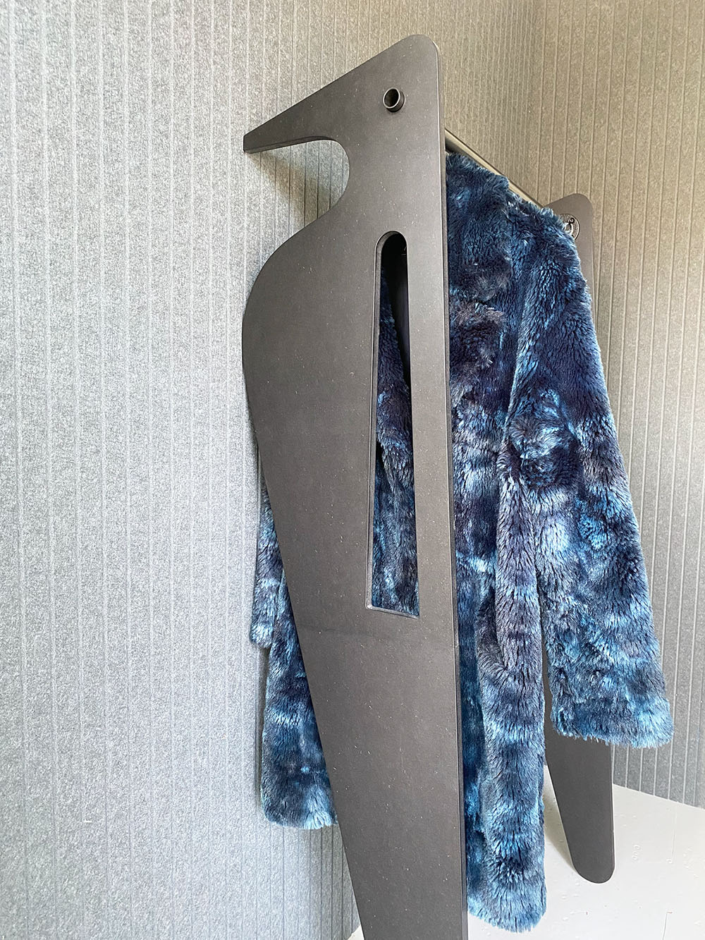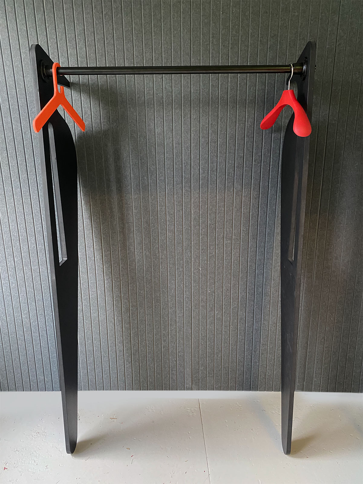 De Bird consists of two wooden sides and a steel support. Easy to assemble. It leans, so no screws are needed. The Bird is designed so that clothing becomes part of the bird. The underside is rounded, which gives the design a lightness. Note also the beautiful shadow effect. Produced by Studio Jeroen Wand, Eindhoven.
