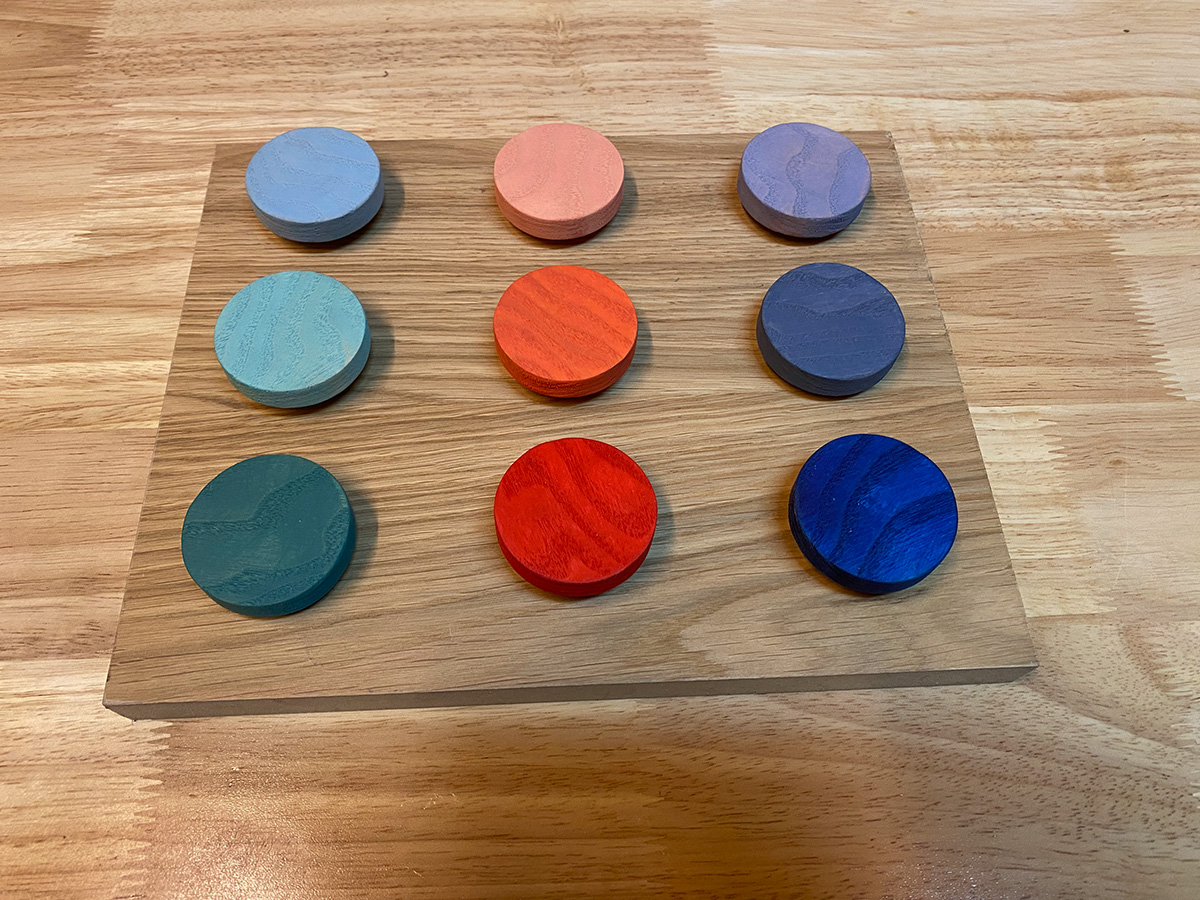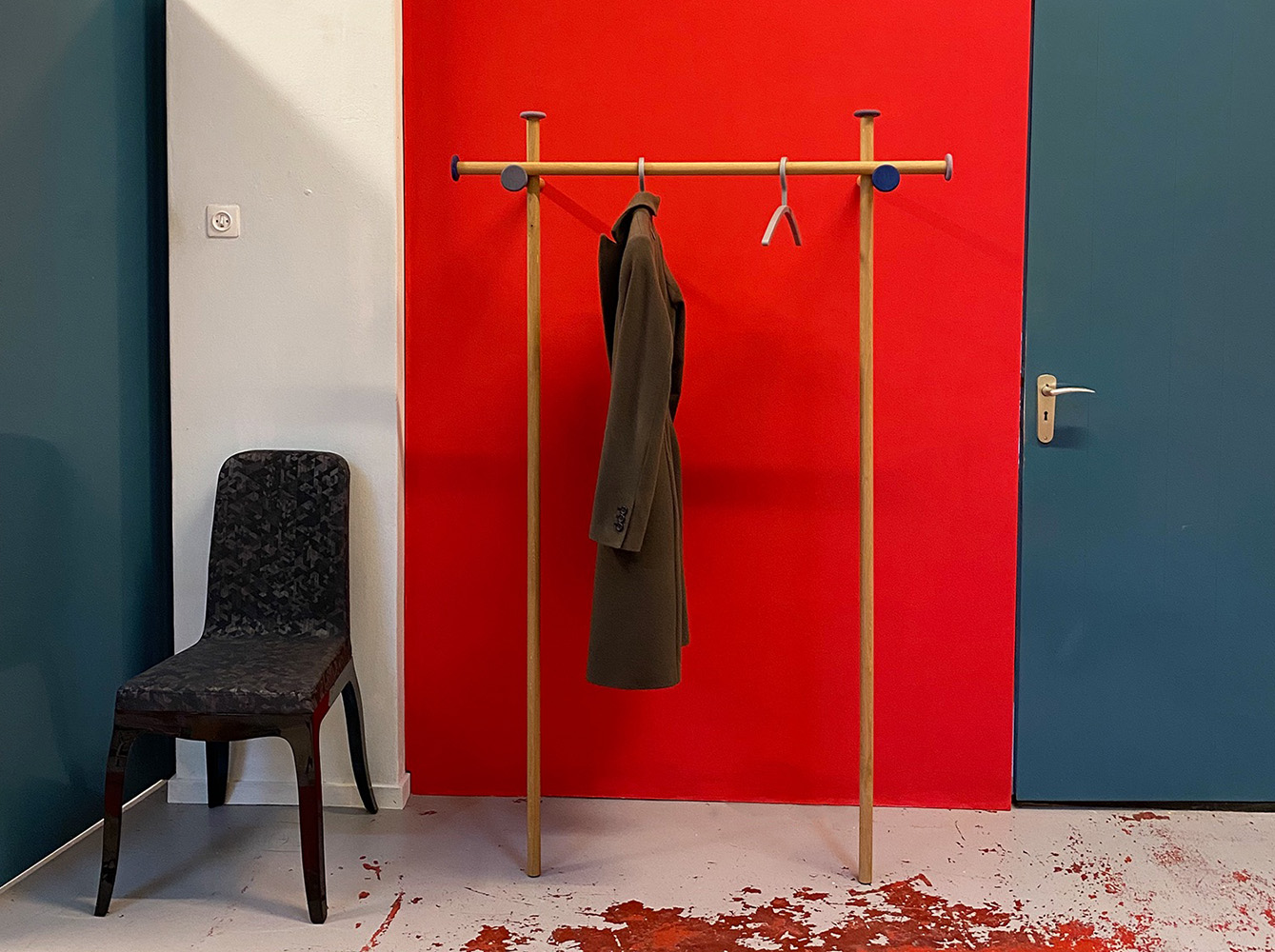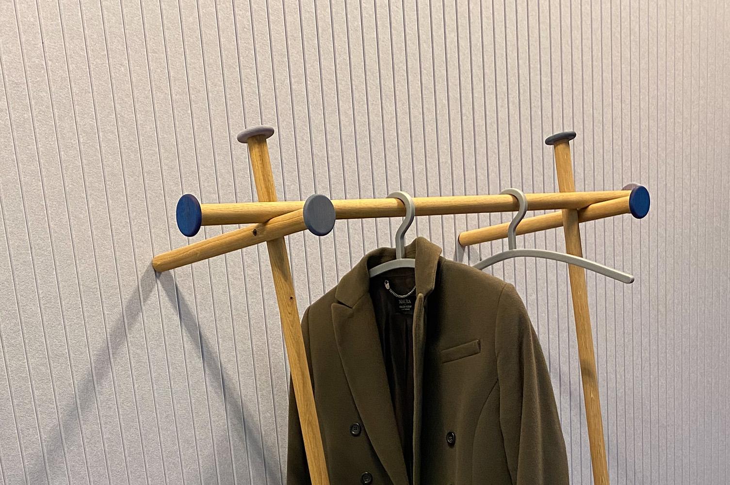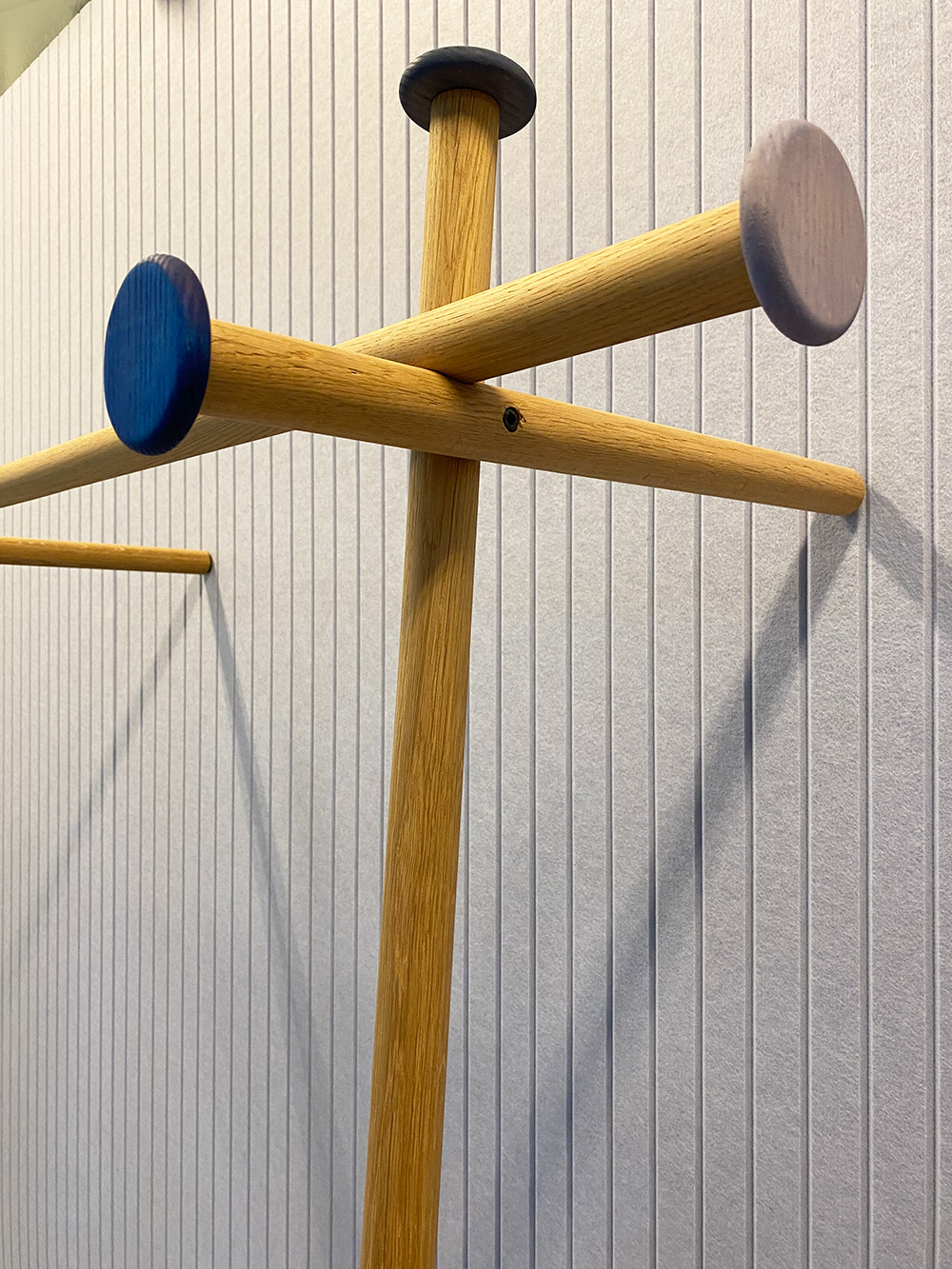 Doctorandus Dopp Blue consists of five ash wood rods. They are connected in a sophisticated way and merge slightly. Easy to assemble. The Doctorandus leans back, so screws are not necessary. The Doctorandus has a cap at the free ends to close it off. Hangers cannot slide off and they protect the shape of whatever is thrown on them, such as caps, muses, hats, and coats. We chose three colors of natural linseed oil, based on natural ingredients. There is a blue set, a green set, and a red set. Production is in the hands of Studio Jeroen Wand.