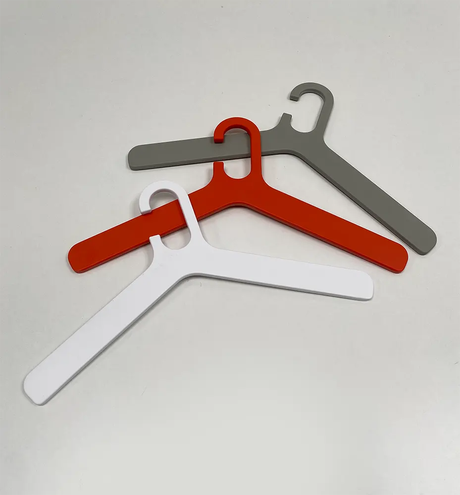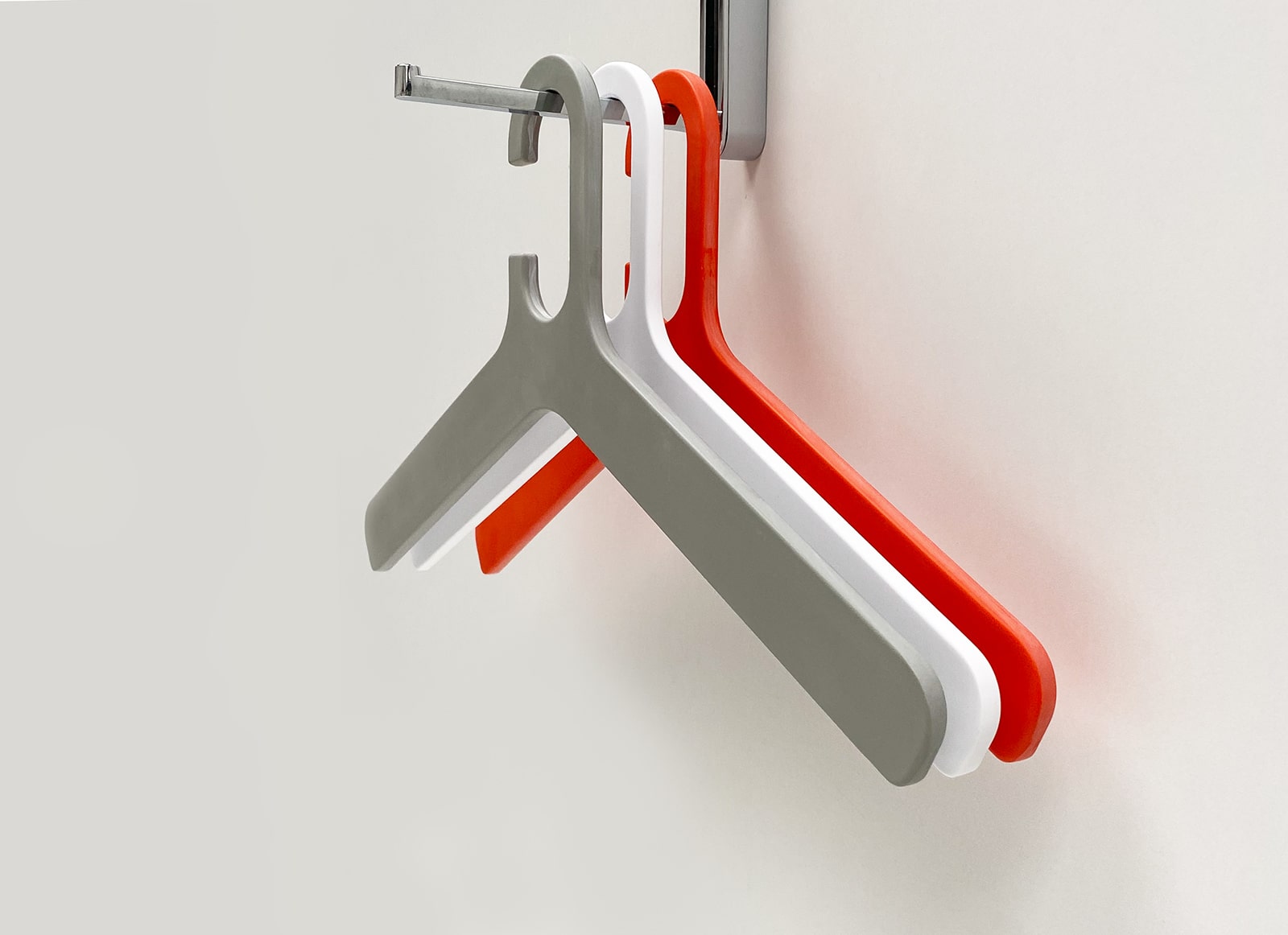 Grado Orange is a plastic clothes hanger with an abstract minimalist shape and rounded ends for the shoulders. Made from sleek matte melamine. Also available in gray and white. Can be purchased individually.