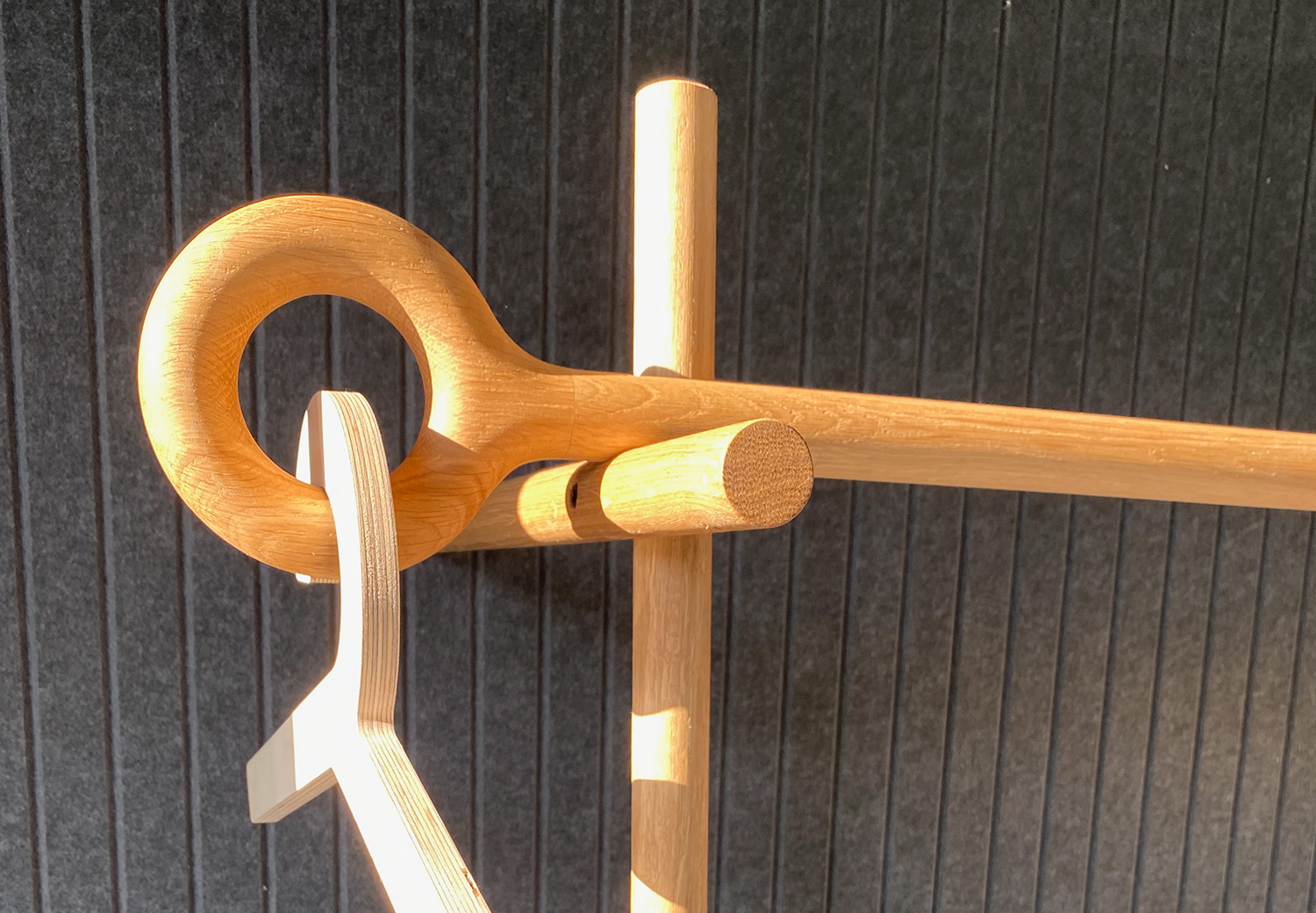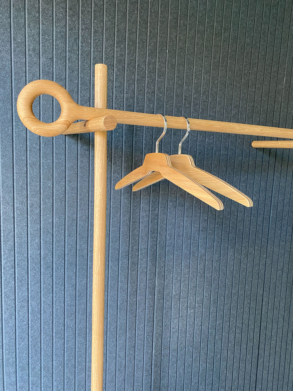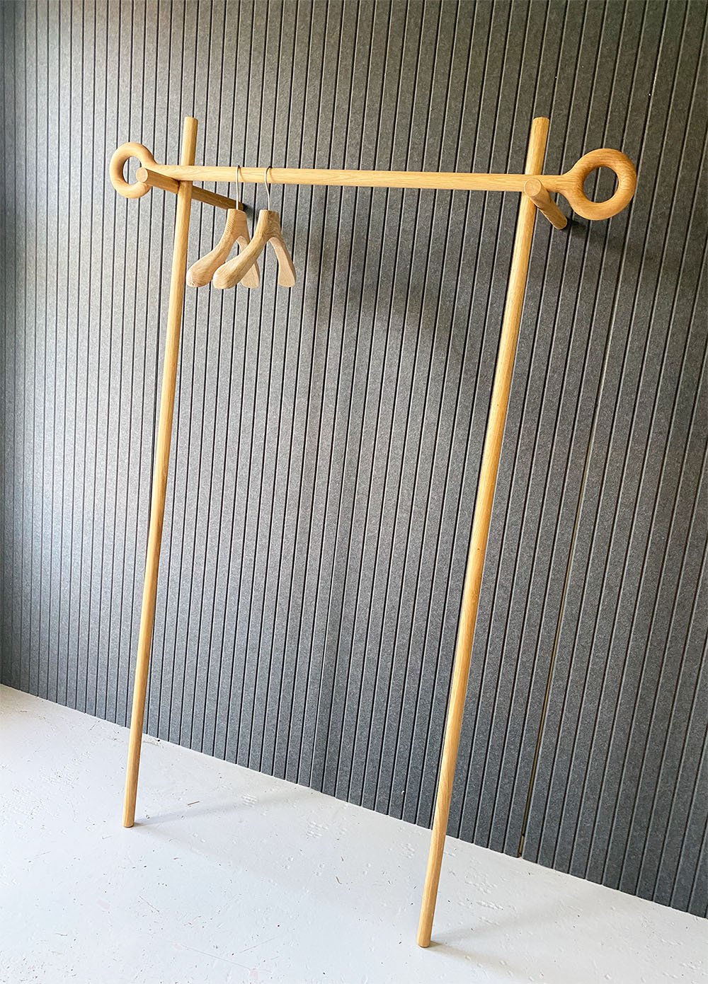 Professor Stok consists of five oak sticks. They are cleverly connected and merge slightly. Easy to assemble. It leans, so no screws are needed. Professor keeps an eye on your clothes and makes your entrance spacious and stylish. Produced by Studio Jeroen Wand.