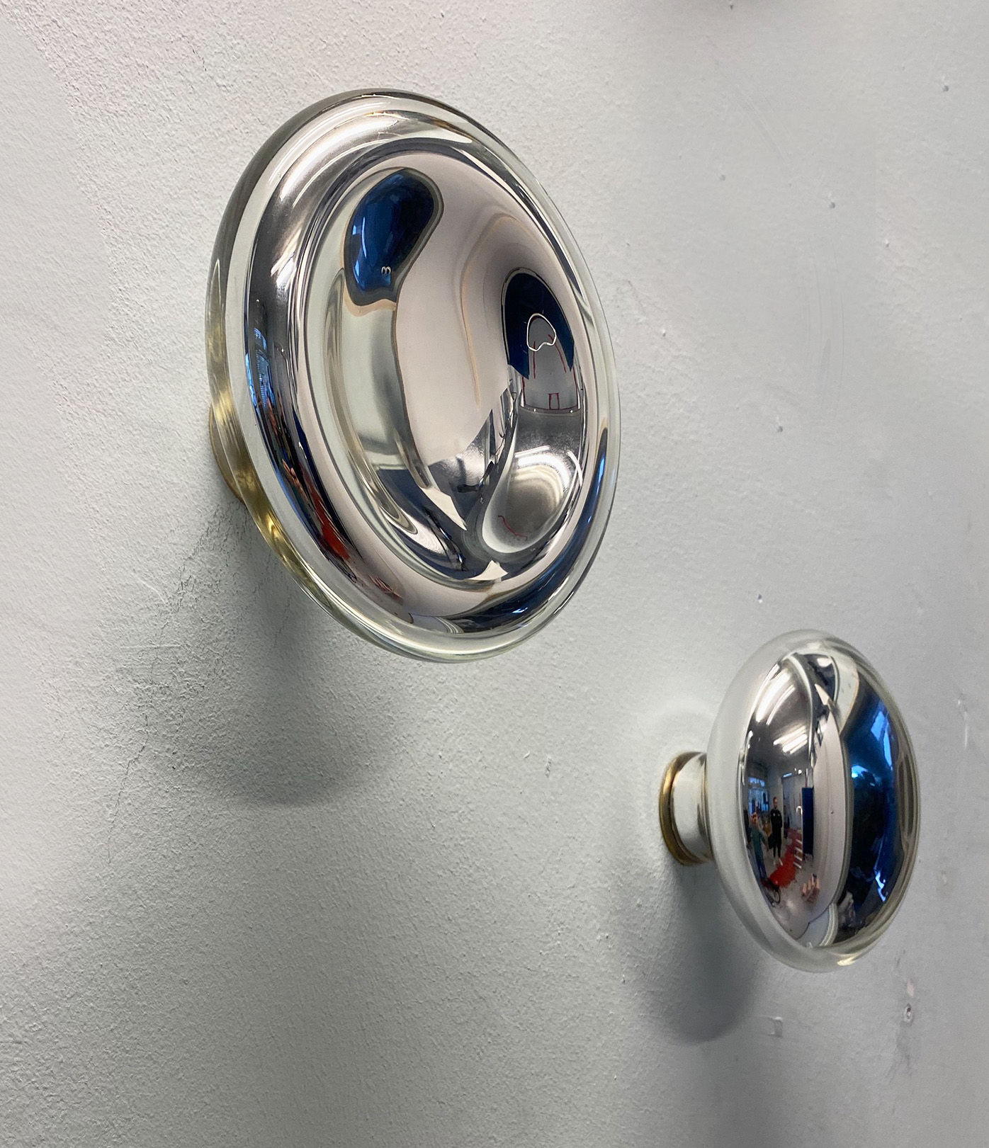 Three Mushrooms is a set of three mouth-blown glass wall hooks, silver-plated on the inside. This creates a beautiful effect as wall decoration and is intended for hanging a bathrobe. The set is also called Hiero, Daaro, and Waaro because of the optical distortion when you look at yourself in the mirror. The Mushrooms are also available separately on request. There is a Hollow, a Convex, and a Flat version. The diameters are on average 17 cm and the depth is around 10 cm. Delivery time is between 0-12 weeks. Specially designed for the To Come and to Go exhibition during DDW 20225 (Dutch Design Week).